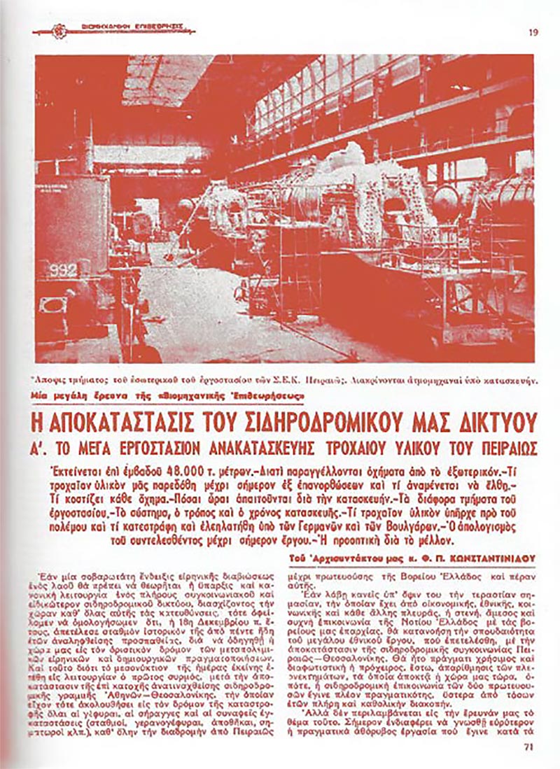 - Νέον Εργοστάσιον τροχαίου υλικού Θεσσαλονίκης. Με διεξοδική αναφορά του τι περιήλθε ως πολεμικές επανορθώσεις από Γερμανία («33 ατμάμαξαι, εξ ων 25 επισκευάσιμαι, αι υπόλοιποι 8 προς διάλυσιν»), και Ιταλία, τι από το «διασυμμαχικόν υλικόν της Ευρώπης» («27 ατμάμαξαι πορείας, 20 ατμάμαξαι ελιγμών»), τι από την ΟΥΝΡΡΑ/βοήθεια (16 ατμάμαξαι). Ερωτήσεις όπως «διατί αι ατμομηχαναί, τα “σασσί” και τα λοιπά μηχανήματα των αμαξών δεν κατασκευάζονται ενταύθα;», όπως και εξήγηση τι κοστίζει κάθε όχημα, ή ακόμη και ποιες μέθοδοι κατασκευής εφαρμόζονται όλα καλύπτονται διεξοδικά!