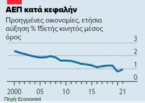 Μεγάλο μέρος αυτής της επιβράδυνσης ανάγεται σε δυνάμεις ακαταμάχητες, όπως είναι η γήρανση του πληθυσμού. Ορισμένες πλευρές του φαινομένου, πάντως, επιδέχονται ανατροπή. Πλην, όμως, η ανάκαμψη των ρυθμών ανάπτυξης έχει υποχωρήσει επικίνδυνα μεταξύ των προτεραιοτήτων των πολιτικών. Τα εκλογικά τους προγράμματα ασχολούνται λιγότερο με την αύξηση του ΑΕΠ, ενώ και η όρεξη για την προώθηση μεταρρυθμίσεων έχει περιοριστεί.