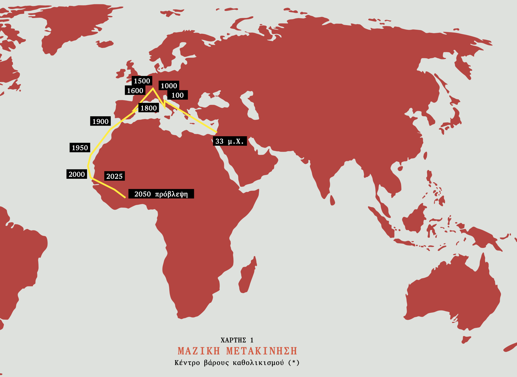 Ο πρώτος δείκτης έχει υπολογισθεί με στοιχεία από το Θεολογικό Σεμινάριο Gordon-Conwell –Αμερικανικό Ινστιτούτο Ευαγγελιστών– και δείχνει πού βρισκόταν στατιστικά το κέντρο βάρους του πληθυσμού των καθολικών ανά την υφήλιο, ήδη από το 33 μ.Χ. Η μέθοδος αυτή καταγράφει εκείνο το σημείο όπου ίσος αριθμός καθολικών βρίσκονται στα βόρεια, στα νότια, στα ανατολικά και στα δυτικά (Χάρτης 1).