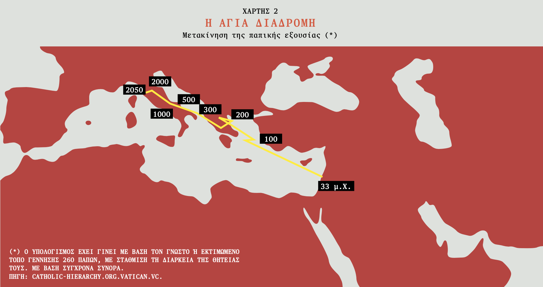 H μέθοδος αυτή χρονικογραφεί την περίπλοκη ιστορία της Καθολικής Εκκλησίας. Το στατιστικό κέντρο βάρους της ξεκινά στους λόφους και τις ερήμους γύρω από τη Βηθλεέμ (η οποία θεωρείται ότι υπήρξε τόπος γέννησης του Ιησού) και την Ιερουσαλήμ (τόπος σταύρωσής του). Μετά τον θάνατό του, ο Απόστολος Πέτρος –που θεωρείται από τους καθολικούς ως ο πρώτος Πάπας– ταξίδεψε στη Ρώμη, την τότε πολύβουη πρωτεύουσα της Ρωμαϊκής Αυτοκρατορίας. Σύμφωνα με την καθολική πίστη, ο Πέτρος εκτελέσθηκε από τον αυτοκράτορα Νέρωνα στον Λόφο του Βατικανού, ένα ειδωλολατρικό νεκροταφείο έξω από την αρχαία Ρώμη. (Λέγεται ότι ζήτησε να σταυρωθεί ανάποδα, καθώς δεν θεωρούσε τον εαυτό του άξιο να πεθάνει στην ίδια στάση με τον Ιησού). Ο τόπος αυτός σταδιακά μετατράπηκε σε έδρα της Εκκλησίας – λιγότερο λόγω της σύνδεσής του με τη ζωή του Ιησού και περισσότερο λόγω της πολιτικής και συμβολικής του σημασίας.