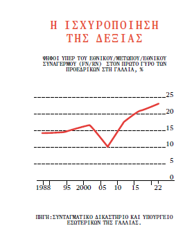 Όταν το Κόμμα της Ελευθερίας, ο βασικός ακροδεξιός σχηματισμός της Αυστρίας, κλήθηκε να συμμετάσχει σε κυβέρνηση συνασπισμού το 2000, οι υπόλοιπες κυβερνήσεις της ΕΕ είχαν εκδηλώσει τέτοια φρίκη, ώστε περιόρισαν –σε ένδειξη διαμαρτυρίας– τις επαφές τους με την Αυστρία στο ελάχιστο δυνατό. Η επιλογή αυτή δεν είχε κανένα αποτέλεσμα, καθώς έκτοτε η ακροδεξιά δεν έπαψε να καταγράφει το ένα ρεκόρ μετά το άλλο. Και για πρώτη φορά ηγήθηκε ευρωπαϊκής κυβέρνησης το 2010, όταν το Fidesz –άλλοτε κεντρώος σχηματισμός, που έκανε όμως λαϊκιστική στροφή– κατέλαβε την εξουσία στην Ουγγαρία. Όσοι, δε, έλεγαν ότι κάτι τέτοιο δεν θα μπορούσε να συμβεί σε ώριμες δημοκρατίες της Δυτικής Ευρώπης διαψεύσθηκαν πέρσι όταν το FdI πήρε την εξουσία στην Ιταλία. Κι αυτό δεν σταματά εδώ. Ακροδεξιά κόμματα αναμένεται να καταγράψουν επιτυχίες στις Ευρωεκλογές του 2024. Η Τζόρτζια Μελόνι, επικεφαλής του FdI και πρωθυπουργός της Ιταλίας, καταβάλλει προσπάθειες για να πείσει την κεντροδεξιά συμμαχία στο Ευρωκοινοβούλιο –το Ευρωπαϊκό Λαϊκό Κόμμα/ΕΛΚ– να ενώσει δυνάμεις με τους ακροδεξιούς Ευρωπαίους Συντηρητικούς και Ρεφορμιστές/ΕΣP, επικεφαλής των οποίων βρίσκεται η ίδια. Μια τέτοια προσέγγιση θα έστρεφε συνολικά τον νομοθετικό θεσμό της ΕΕ προς λαϊκίστικη κατεύθυνση. Εν τω μεταξύ, στη Γαλλία οι επιδόσεις της ακροδεξιάς βελτιώνονται σε κάθε διαδοχική προεδρική εκλογή (βλ. Διάγραμμα). Είναι ενδεχόμενο η Μαρί Λεπέν, η οποία στις τελευταίες δυο προεδρικές βρέθηκε δεύτερη, να κερδίσει στις επόμενες κάλπες – του 2027.