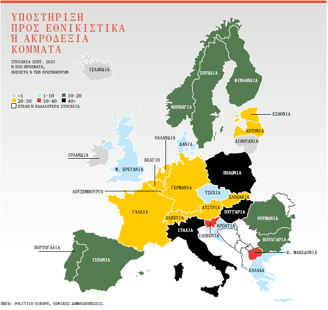 ΤΕΣΣΕΡΙΣ ΑΠΟ ΤΙΣ ΠΕΝΤΕ ΠΟΛΥΠΛΗΘΕΣΤΕΡΕΣ ΧΩΡΕΣ ΤΗΣ ΕΥΡΩΠΑΪΚΗΣ ΕΝΩΣΗΣ ΕΧΟΥΝ ΑΚΡΟΔΕΞΙΑ ΚΟΜΜΑΤΑ ΕΙΤΕ ΣΤΗΝ ΚΥΒΕΡΝΗΣΗ, ΕΙΤΕ ΜΕ ΔΗΜΟΣΚΟΠΙΚΗ ΚΑΤΑΓΡΑΦΗ ΑΝΩ ΤΟΥ 20%.