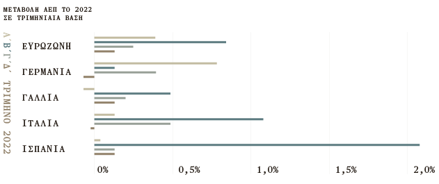 Το ΑΕΠ στην Ευρωζώνη αυξήθηκε κατά 0,1% το τέταρτο τρίμηνο του 2022 σε σύγκριση με το προηγούμενο τρίμηνο, σύμφωνα με την πρώτη εκτίμηση της Eurostat. Σε σύγκριση με το ίδιο τρίμηνο του προηγούμενου έτους, το ΑΕΠ της Ευρωζώνης αυξήθηκε κατά 1,9%, ενώ για το σύνολο του 2022 ο ετήσιος ρυθμός ανάπτυξης διαμορφώθηκε στο 3,5%.