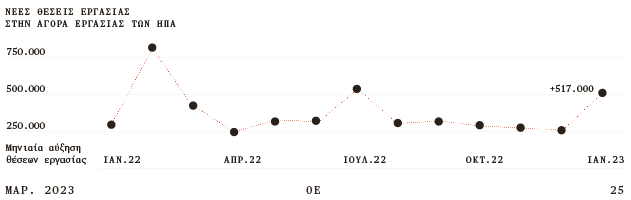 Το ποσοστό ανεργίας στις ΗΠΑ υποχώρησε τον Ιανουάριο κάτω από το 3,5% για πρώτη φορά μετά το 1970. Η απασχόληση στο σύνολο της αμερικανικής οικονομίας, πλην του γεωργικού τομέα, ενισχύθηκε κατά 517.000 θέσεις εργασίας, ενώ οι αναλυτές προέβλεπαν αύξηση από 125.000 (οι πιο συγκρατημένοι) μέχρι 305.000 (οι πιο αισιόδοξοι). Επιπλέον, τα στοιχεία για τον Δεκέμβριο αναθεωρήθηκαν υψηλότερα, για να δείξουν ότι προστέθηκαν 260.000 θέσεις εργασίας αντί για 223.000 που είχαν ανακοινωθεί προηγουμένως.