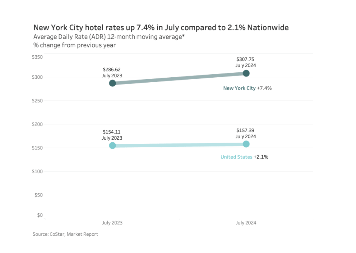 Σύμφωνα με δεδομένα της CoStar, οι μέσες τιμές των ξενοδοχείων στη Νέα Υόρκη αυξήθηκαν κατά 7,4% μέσα σε 12 μήνες, σε σύγκριση με μόνο 2,1% αύξηση σε εθνικό επίπεδο1.