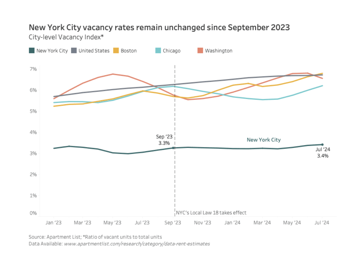 Τα κενά διαμερίσματα παραμένουν στα ίδια επίπεδα: Σύμφωνα με την Apartment List, τα ποσοστά κενών διαμερισμάτων στη Νέα Υόρκη παραμένουν σχεδόν αμετάβλητα (3,4%) από την εφαρμογή του νόμου.