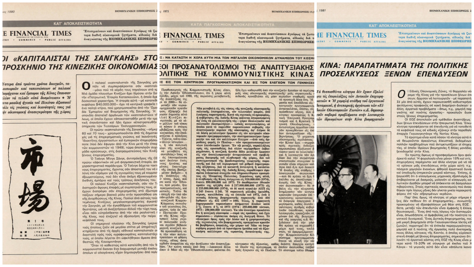 Για να ενισχυθεί η εμπιστοσύνη των ξένων επενδυτών, το Πεκίνο προχωρά σε τολμηρά βήματα. Τον Δεκέμβριο του 1979 η Βιομηχανική φιλοξενεί to άρθρο των Financial Times «Κίνα: Πολιτικαί μεταρρυθμίσεις και νέοι οικονομικοί – αναπτυξιακοί προσανατολισμοί». Ξεκινά με την είδηση: «Στην επιθυμία της να παρουσιάση μια οικονομική “εικόνα” που θα εμπνεύση εμπιστοσύνη σε ξένους επενδυτάς, η Κίνα έκανε πριν λίγους μήνες μια πρωτοφανή χειρονομία: άνοιξε τα “λογιστικά βιβλία” της στον υπόλοιπο κόσμο!».