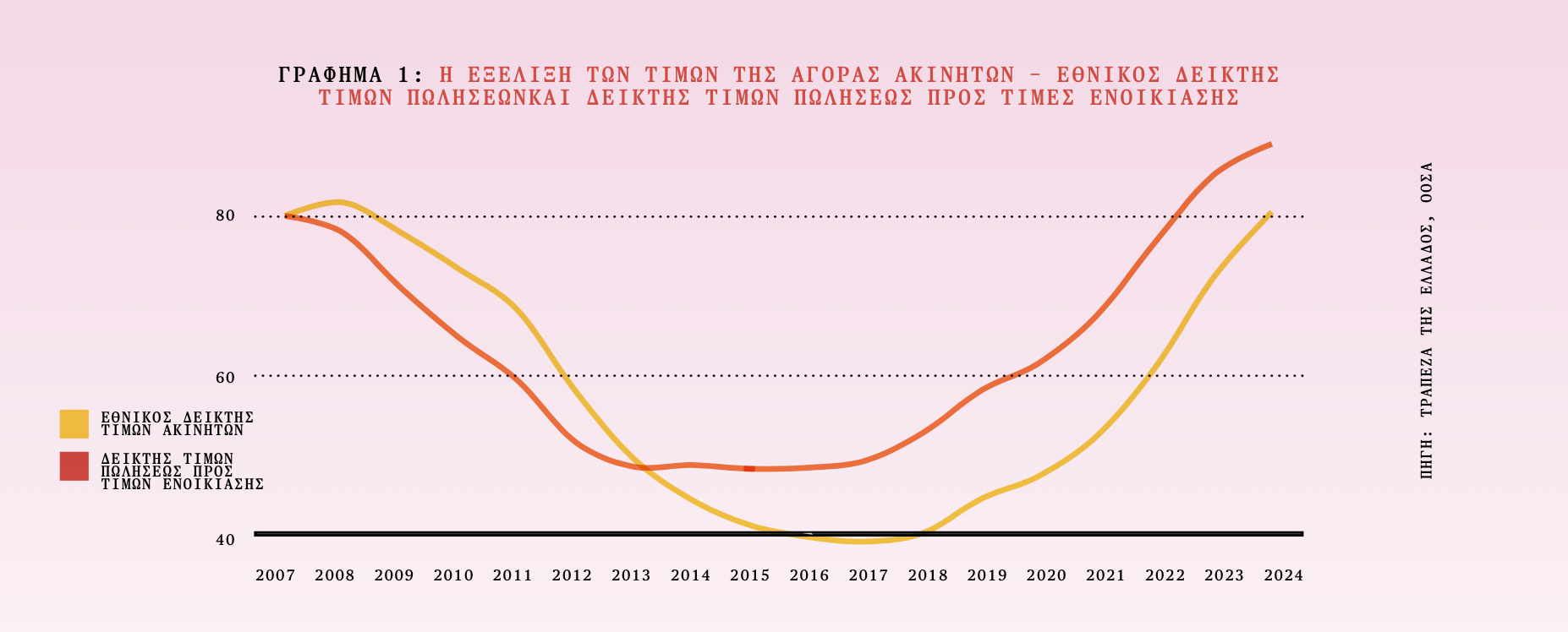 ΣΗΜΕΡΑ, ΟΙ ΤΙΜΕΣ ΤΩΝ ΑΚΙΝΗΤΩΝ, ΟΠΩΣ ΚΑΤΑΓΡΑΦΟΝΤΑΙ ΑΠΟ ΤΟΝ ΔΕΙΚΤΗ ΠΟΥ ΚΑΤΑΡΤΙΖΕΙ Η ΤΡΑΠΕΖΑ ΤΗΣ ΕΛΛΑΔΟΣ ΒΡΙΣΚΟΝΤΑΙ ΣΕ ΙΣΤΟΡΙΚΑ ΥΨΗΛΑ. ΤΑΥΤΟΧΡΟΝΑ, Ο ΔΕΙΚΤΗΣ ΤΙΜΩΝ ΠΩΛΗΣΕΩΣ ΩΣ ΠΡΟΣ ΤΙΣ ΤΙΜΕΣ ΕΝΟΙΚΙΑΣΗΣ (PRICE-TO-RENT RATIO), Ο ΟΠΟΙΟΣ ΧΡΗΣΙΜΟΠΟΙΕΙΤΑΙ ΣΥΧΝΑ ΣΤΗ ΒΙΒΛΙΟΓΡΑΦΙΑ ΩΣ ΕΝΔΕΙΞΗ ΘΕΡΜΑΝΣΗΣ ΤΗΣ ΑΓΟΡΑΣ, ΚΑΤΑΓΡΑΦΕΙ ΚΑΙ ΑΥΤΟΣ ΥΨΗΛΟΤΕΡΕΣ ΤΙΜΕΣ ΑΠΟ ΤΟ ΠΡΟΗΓΟΥΜΕΝΟ ΥΨΗΛΟ ΤΟΥ 2007. ΩΣΤΟΣΟ, ΔΕΝ ΕΙΝΑΙ ΣΑΦΕΣ ΑΝ Η ΠΑΡΑΤΗΡΟΥΜΕΝΗ ΑΝΟΔΟΣ ΤΩΝ ΤΙΜΩΝ ΑΝΤΙΚΑΤΟΠΤΡΙΖΕΙ ΤΙΣ ΘΕΜΕΛΙΩΔΕΙΣ ΣΥΝΘΗΚΕΣ ΤΗΣ ΑΓΟΡΑΣ Η ΑΝ ΕΝΣΩΜΑΤΩΝΕΙ ΠΡΟΣΔΟΚΙΕΣ ΠΟΥ ΥΠΕΡΒΑΙΝΟΥΝ ΤΙΣ ΜΑΚΡΟΟΙΚΟΝΟΜΙΚΕΣ ΠΡΟΟΠΤΙΚΕΣ.