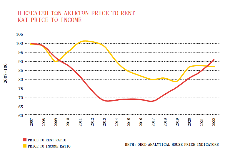 Συγκεκριμένα, για τα ελληνικά νοικοκυριά, αν και παρατηρούμε αύξηση του ονομαστικού εισοδήματος, τα υψηλά επίπεδα πληθωρισμού λόγω των δημοσιονομικών μέτρων κατά την περίοδο του COVID-19, αλλά και του πολέμου στην Ουκρανία μεταξύ άλλων, αυξάνουν τους περιορισμούς στους προϋπολογισμούς των νοικοκυριών, δημιουργούν αβεβαιότητα και αυξάνουν το κόστος στέγασης. Δεδομένων αυτών, δύο δείκτες που μπορούν να μας δώσουν μια εικόνα για το αν το επίπεδο των τιμών των οικιστικών ακινήτων είναι κοντά στην αντικειμενική τους αξία, αλλά και το αν τα νοικοκυριά μπορούν να αντεπεξέλθουν σε αυτά τα επίπεδα, είναι ο λόγος της τιμής πώλησης προς την τιμή της ενοικίασης (price to rent ratio), και ο λόγος της τιμής πώλησης ακινήτων ως προς το εισόδημα των νοικοκυριών (price to income ratio). Ο πρώτος λόγος βοηθά στην κατανόηση του επιπέδου των τιμών και τα πιθανά ενδεχόμενα διόρθωσης, ενώ ο δεύτερος βοηθά να κατανοήσουμε την εξέλιξη της ζήτησης για νέο δανεισμό, αλλά και την ευημερία των νοικοκυριών σε σχέση με τις τιμές των ακινήτων. Κάτι τέτοιο έχει ενδιαφέρον, μιας και τα ελληνικά νοικοκυριά, όπως παρουσιάζεται σε πρόσφατη δημοσίευση της Eurostat, έχουν, μακράν του δευτέρου ανάμεσα σε κράτη-μέλη της Ευρωπαϊκής Ένωσης, το υψηλότερο κόστος στέγασης, ως πληρωμές δανείων, ενοικίων, αλλά και για λογαριασμούς ύδρευσης και ηλεκτροδότησης, μεταξύ άλλων.