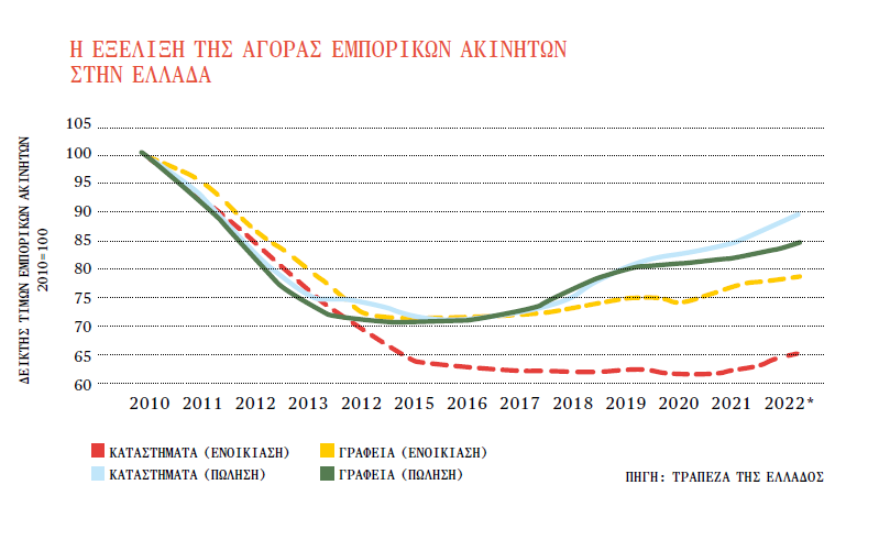 Σχετικά με την αγορά εμπορικών ακινήτων και σύμφωνα με τα δεδομένα από την Τράπεζα της Ελλάδος, η αγορά ακολουθεί παρόμοια πορεία με την αγορά οικιστικών ακινήτων. Τα εμπορικά ακίνητα, και ιδιαίτερα εκείνα τα οποία είναι προς πώληση, επιδεικνύουν ισχυρότερες ανοδικές τάσεις σε σχέση με εκείνα προς ενοικίαση, υπονοώντας ισχυρές δυναμικές επενδύσεων στην αγορά. Η εξέλιξη της αγοράς των εμπορικών ακινήτων είναι ιδιάζουσας σημασίας, όχι μόνο γιατί αποτελεί σημαντικό μοχλό ανάπτυξης της οικονομίας, καθώς συμβάλλει περίπου στο 15% του εγχώριου ΑΕΠ, το οποίο βρίσκεται και πολύ κοντά στον ευρωπαϊκό μέσο όρο της προστιθέμενης αξίας στο ΑΕΠ (Vulnerabilities in the EEA commercial real estate sector, ESRB, 2023), αλλά και γιατί οι διακυμάνσεις στις τιμές της αγοράς εμπορικών ακινήτων είναι άρρηκτα συνδεδεμένες με τη χρηματοπιστωτική αγορά. Διορθώσεις στις τιμές των εμπορικών ακινήτων μπορούν να έχουν άμεσες επιδράσεις στη σταθερότητα του χρηματοπιστωτικού συστήματος, μιας και τα ακίνητα χρησιμοποιούνται ως ενέχυρα για περαιτέρω δανεισμό, αλλά και ως μοχλός νέων επενδύσεων. Σύμφωνα με το ειδικό θέμα της πιο πρόσφατης έκθεσης χρηματοπιστωτικής σταθερότητας της Τράπεζας της Ελλάδος, πιθανές διαταραχές στην αγορά εμπορικών ακινήτων μπορεί να έχουν μεγαλύτερες επιπτώσεις στην οικονομία σε σχέση με την οικιστική αγορά ακινήτων, καθώς οι δανειολήπτες που έχουν σαν ενέχυρο κάποιο εμπορικό ακίνητο, είναι πιο πιθανό να αθετήσουν τις οφειλές τους, σε αντίθεση με ένα νοικοκυριό, για το οποίο η στέγαση αποτελεί βασικό αγαθό.