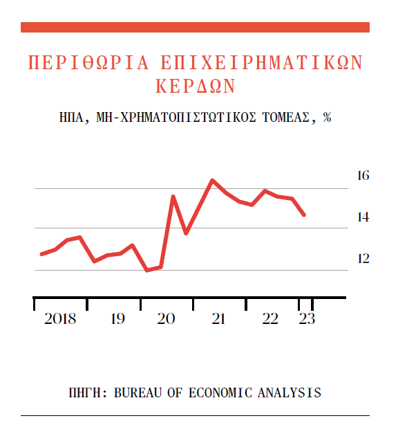 Η ευρωπαϊκή οικονομία δεν υπερθερμάνθηκε τόσο πολύ ούτε τόσο γρήγορα όσο η αμερικανική. Όμως η Ευρωζώνη είχε βρεθεί να δαπανά προσφάτως 3,3% του ΑΕΠ της προκειμένου να επιδοτεί τους λογαριασμούς ηλεκτρικού ρεύματος, ενώ τα επιτόκιά της παραμένουν πολύ χαμηλά – αν δηλαδή τα συγκρίνει κανείς με τον δομικό πληθωρισμό. Σήμερα, πάντως, τα συμπτώματα είναι ανάλογα: υψηλός δομικός πληθωρισμός, υψηλά κέρδη, καθώς και μισθοί που ανεβαίνουν γρήγορα λόγω της σφιχτής αγοράς εργασίας. Φαίνεται πιθανό τα περιθώρια κέρδους να ακολουθήσουν μια πτωτική διαδρομή, όπως και στις ΗΠΑ: προβλέπεται υποχώρηση των κερδών των εταιριών που είναι εισηγμένες σε Χρηματιστήριο αργότερα μέσα στον χρόνο.