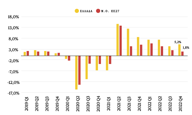 Ειδικότερα, από τα μέσα του 2021, ο ρυθμός μεγέθυνσης του εγχώριου ΑΕΠ είναι υψηλότερος από τον αντίστοιχο μέσο όρο της Ευρωπαϊκής Ένωσης. Επιπλέον, ενώ ο μέσος ρυθμός ανάπτυξης στην ΕΕ27 μειωνόταν διαχρονικά τα διαδοχικά τρίμηνα του 2022, το εγχώριο ΑΕΠ παρουσίασε υψηλότερη ετήσια αύξηση κατά +5,2% το τελευταίο τρίμηνο του 2022, σε σχέση με την ετήσια αύξηση του +4,4% το 3ο τρίμηνο του ίδιου έτους. Συνολικά, σύμφωνα με τα πιο πρόσφατα επίσημα στοιχεία, η εκτίμηση για την ετήσια ανάπτυξη της ελληνικής οικονομίας το 2022 είναι στο 5,9%, ενώ η εκτίμηση της ετήσιας ανάπτυξης για την οικονομία της ΕΕ27 είναι στο 3,5%.