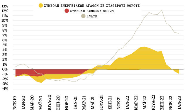 Ο έντονος πληθωρισμός αποτελεί τον πιο άμεσο κίνδυνο για την ελληνική οικονομία βραχυχρόνια. Εν μέσω της παγκόσμιας ενεργειακής κρίσης και των εξωγενών πληθωριστικών πιέσεων, ο εγχώριος πληθωρισμός το 2022 διαμορφώθηκε στο 9,6%, στο υψηλότερο επίπεδο από το 1994. Εξετάζοντας τη δυναμική του, ο ετήσιος ρυθμός του εγχώριου Εναρμονισμένου Δείκτη Τιμών Καταναλωτή διαμορφώθηκε στο 9,3% το 2022, από 0,6% το 2021. Άρχισε να αποκλιμακώνεται το δεύτερο εξάμηνο πέρυσι, φθάνοντας στο 7,3% τον Ιανουάριο και στο 6,5% τον Φεβρουάριο του 2023. Η σχετική μείωση μπορεί να αποδοθεί κυρίως στην ισχυρότερη αρνητική επίδραση των τιμών των ενεργειακών αγαθών (-0,9%), όμως ο πληθωρισμός των τροφίμων συνέχισε να αυξάνεται.