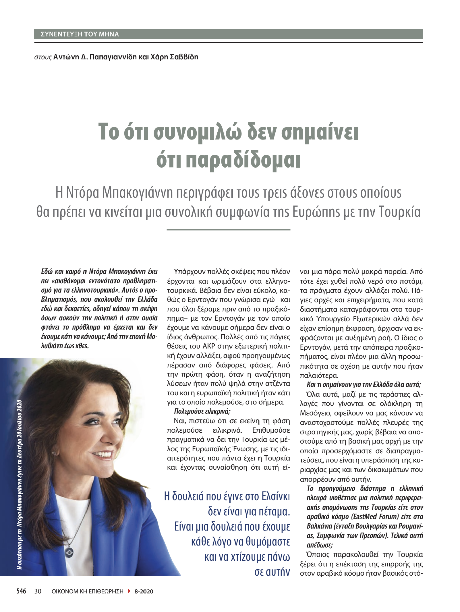 «Το ότι συνομιλώ δεν σημαίνει ότι παραδίδομαι», επισημαίνει από την πλευρά της η Ντόρα Μπακογιάννη. Σε συνέντευξη που παραχώρησε στο περιοδικό τον Αύγουστο του 2020 περιγράφει τρεις άξονες στους οποίους θα πρέπει να κινείται μια συνολική συμφωνία της Ευρώπης με την Τουρκία: τον οικονομικό (τελωνειακή ένωση, οικονομική συνεργασία ΕΕ-Τουρκίας κ.τ.λ.), εκείνον που έχει να κάνει με το προσφυγικό και το νομικό κομμάτι των σχέσεων. «Πρέπει να καθοριστούν οι κανόνες του παιχνιδιού. Η Ευρώπη έχει σύνορα, και έχει υποχρέωση να τα προστατεύσει. Οι δε κανόνες του παιχνιδιού δεν χρειάζεται να εφευρεθούν σήμερα. Είναι οι βασικοί κανόνες του διεθνούς δικαίου, τους οποίους αποδέχονται όλοι».