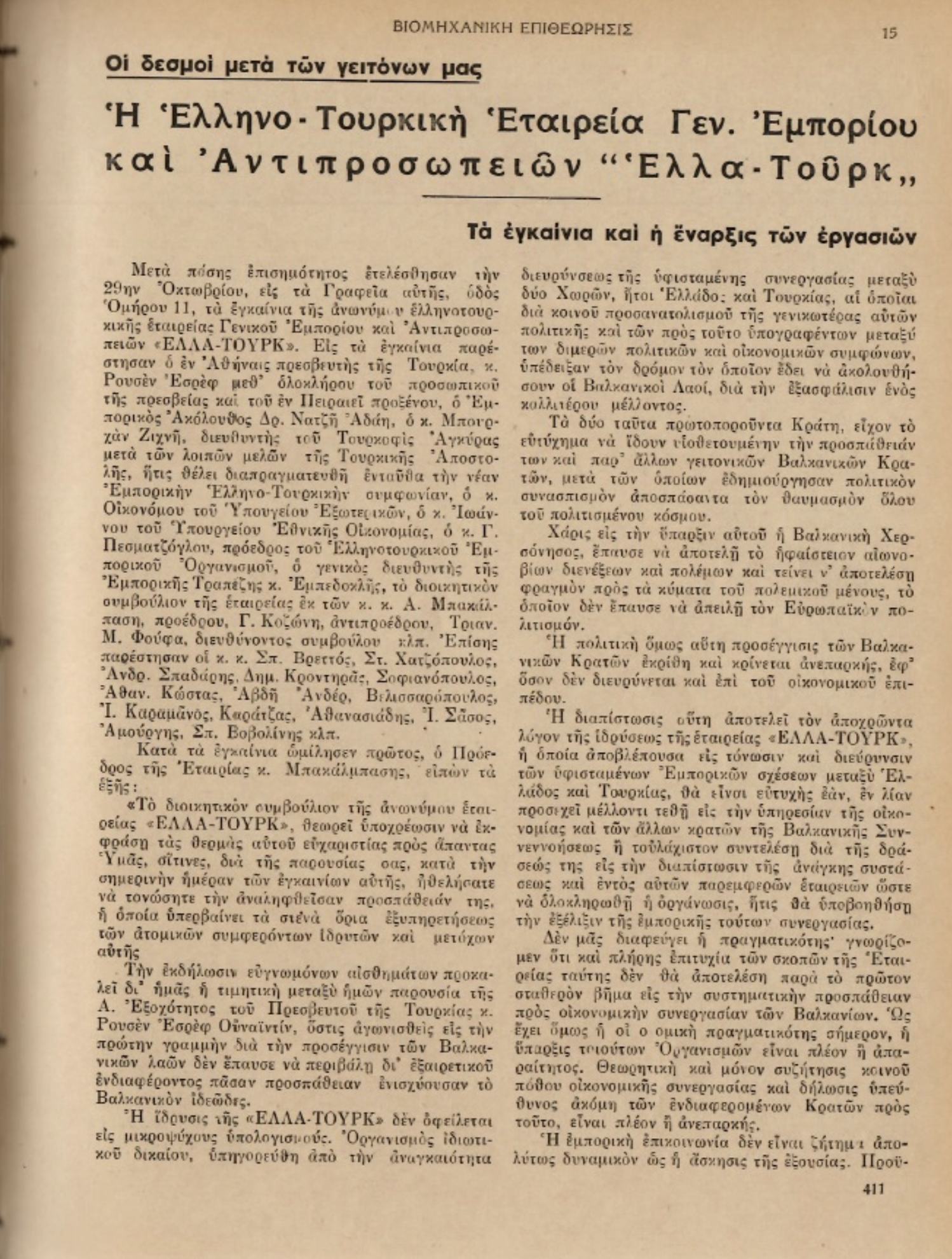 «Μετά πάσης επισημότητος ετελέθησαν την 29ην Οκτωβρίου, εις τα Γραφεία αυτής, οδός Ομήρου 11, τα εγκαίνια της ανωνύμου ελληνοτουρκικής εταιρείας Γενικού Εμπορίου και Αντιπροσωπειών ΕΛΛΑ-ΤΟΥΡΚ» αναφέρει άρθρο της Βιομηχανικής Επιθεώρησης από το μακρινό 1938. Ήταν η περίοδος μετά το Βαλκανικό Σύμφωνο του 1934, που επιστέγασε την προσέγγιση Βενιζέλου – Κεμάλ. Όπως σημειώνει ο πρόεδρος της εταιρείας κ. Α. Μπακάλμπασης «αι υφιστάμεναι μεταξύ των Βαλκανικών Κρατών διμερείς εμπορικαί συμβάσεις, βελτιούμεναι, θα διευκολύνουν το Βαλκανικόν εμπόριον και θα βελτιώσουν, έστω και προσωρινώς, το παθητκό εμπορικόν ισοζύγιον αυτών, έναντι εξωβαλκανικών τυχόν κρατών». Γι’ αυτό και «χαιρετίζομεν με ανυπόκριτον χαράν τας αρξαμένας διαπραγματεύσεις δια την προσαρμογήν της εν ισχύι ελληνο-τουρκικής εμπορικής συμβάσεως».