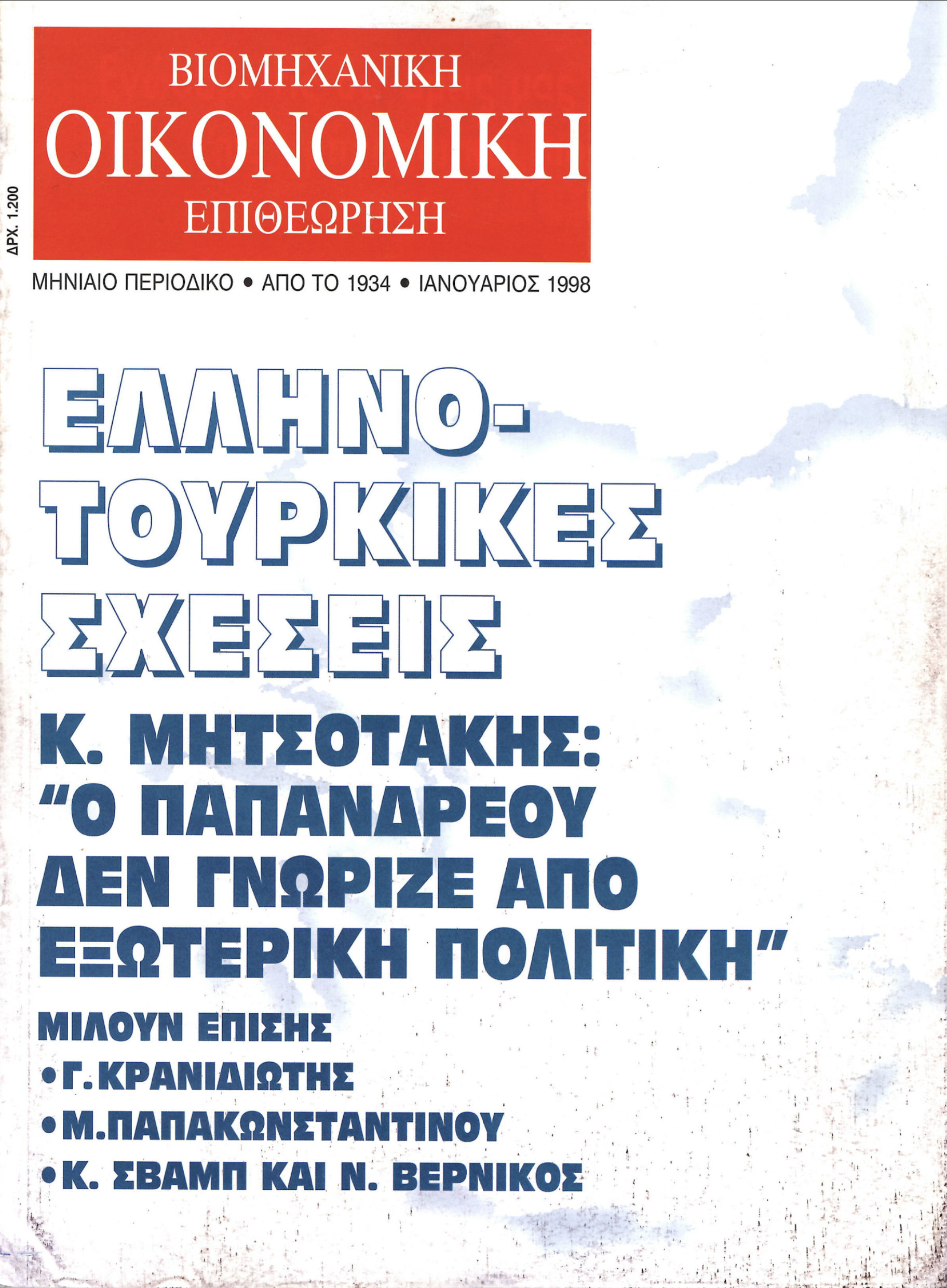 ΤΟΝ ΙΑΝΟΥΑΡΙΟ ΤΟΥ 1998, ΜΕΤΑ ΚΑΙ ΤΗΝ ΚΡΙΣΗ ΣΤΑ ΙΜΙΑ, Ο ΚΩΝΣΤΑΝΤΙΝΟΣ ΜΗΤΣΟΤΑΚΗΣ ΘΑ ΜΙΛΗΣΕΙ ΣΤΟ ΠΕΡΙΟΔΙΚΟ ΓΙΑ ΤΟ ΝΤΑΒΟΣ, ΑΠΟΚΑΛΩΝΤΑΣ ΤΟ ΠΑΝΩΛΕΘΡΙΑ. ΑΦΟΥ ΧΡΕΩΝΕΙ ΣΤΟΝ ΑΝΔΡΕΑ ΠΑΠΑΝΔΡΕΟΥ ΩΣ ΕΣΦΑΛΜΕΝΗ ΠΟΛΙΤΙΚΗ ΤΗΝ ΑΡΝΗΣΗ ΔΙΑΛΟΓΟΥ ΚΑΤΑ ΤΑ ΠΡΩΤΑ ΧΡΟΝΙΑ ΤΗΣ ΔΕΚΑΕΤΙΑΣ ΤΟΥ ’80, ΕΚΤΙΜΑ: «ΚΑΠΟΙΑ ΣΤΙΓΜΗ ΔΕΝ ΤΟ ΑΝΤΕΧΕ ΠΛΕΟΝ ΝΑ ΤΗΡΕΙ ΑΥΤΗ ΤΗ ΘΕΣΗ ΚΑΙ ΞΕΚΙΝΗΣΕ ΚΙΝΗΣΕΙΣ ΔΙΑΛΟΓΟΥ ΣΕ ΥΨΗΛΟ ΕΠΙΠΕΔΟ. ΑΥΤΟ ΗΤΑΝ ΤΟ ΝΤΑΒΟΣ – ΟΠΟΥ ΟΜΩΣ ΕΠΗΓΕ ΑΝΕΤΟΙΜΟΣ. ΓΙ’ ΑΥΤΟ ΚΑΙ ΥΠΕΣΤΗ ΠΑΝΩΛΕΘΡΙΑ ΚΑΙ ΖΗΜΙΩΣΕ ΤΑ ΕΛΛΗΝΙΚΑ ΣΥΜΦΕΡΟΝΤΑ».