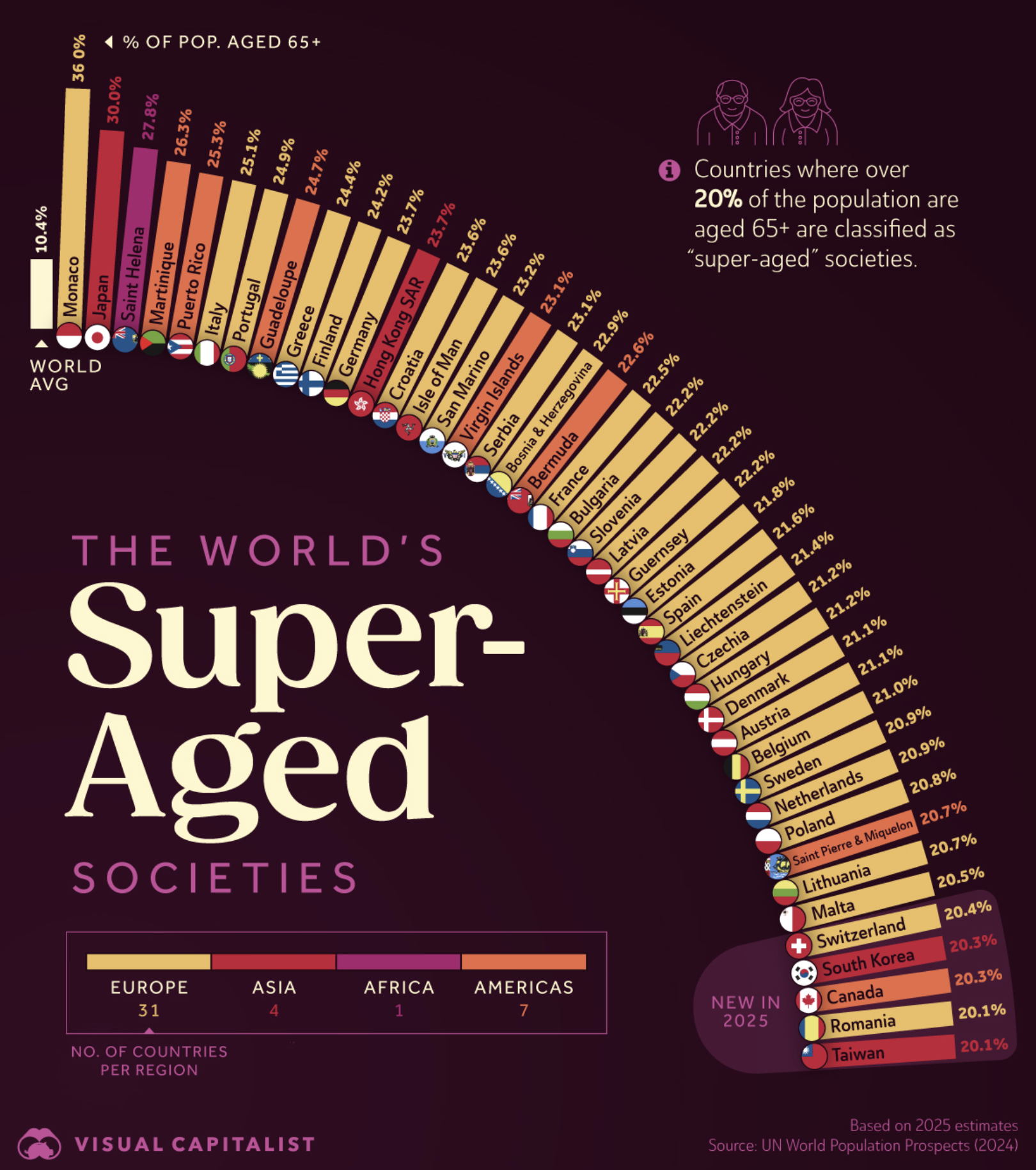 Για να μάθετε περισσότερα σχετικά με αυτή την παγκόσμια τάση, απεικονίσαμε όλες τις κοινωνίες υπερήλικων στον κόσμο το 2025 με βάση τις τελευταίες Παγκόσμιες Προοπτικές Πληθυσμού.