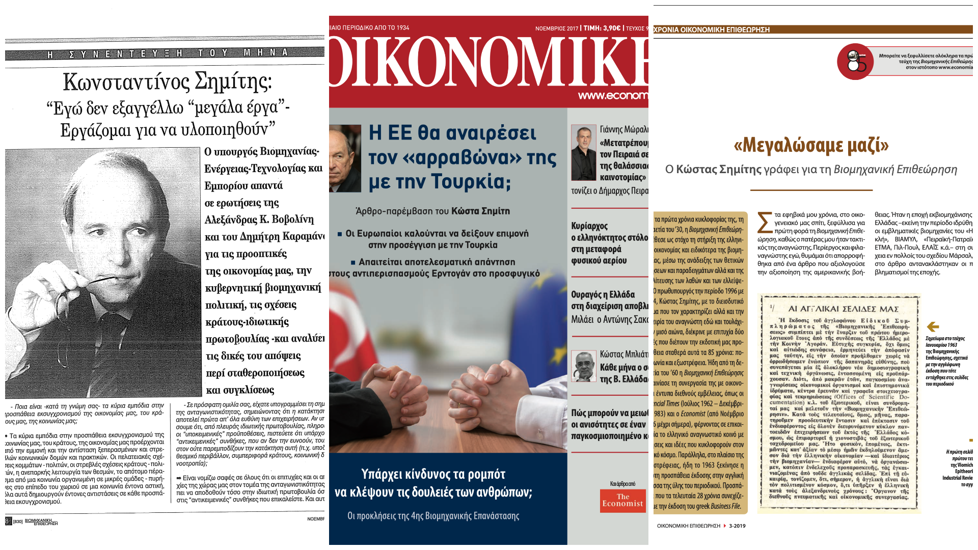 Αφού αναφέρεται στην εξέλιξη του περιοδικού σε Οικονομική Επιθεώρηση και στη συνεργασία με τους Financial Times αρχικά και τον Economist στη συνέχεια, ο Κ. Σημίτης υποστηρίζει ότι «στην ύλη του περιοδικού αποτυπώνονται όλες οι εκφράσεις του ελληνικού επιχειρείν (από τη ναυτιλία ως την έρευνα), αλλά και τα παγκόσμια ζητήματα (όπως είναι η κλιματική αλλαγή και η 4η βιομηχανική επανάσταση) που πρέπει να αλλάξουν την οπτική μας, τη νοοτροπία μας, επομένως και την επιχειρηματική μας παρέμβαση». Και καταλήγει: «Σήμερα αισθάνομαι ότι μεγαλώσαμε μαζί!».
