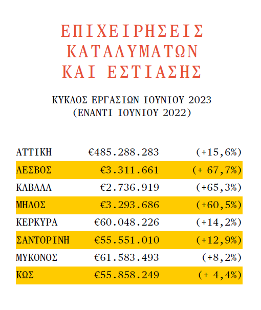 Ο Αύγουστος, σύμφωνα με τον πρόεδρο της Πανελλήνιας Ομοσπονδίας Ξενοδόχων (ΠΟΞ), είχε μέση πληρότητα 90% με τουρίστες κυρίως από Αγγλία, Γερμανία, Κάτω Χώρες, Γαλλία, Ιταλία, Πολωνία, Ισραήλ σε Κρήτη, Ρόδο, Αθήνα, Θεσσαλονίκη και Ιωάννινα (όπου υπάρχει πλέον πτήση), ΗΠΑ, Καναδά, ενώ από τα Βαλκάνια και τον οδικό τουρισμό, που λόγω καιρού ξεκίνησε μετά τις 10 Ιουνίου, πρωταγωνίστησε η Ρουμανία. Συνολικά, την περίοδο Ιανουαρίου-Ιουλίου 2023, σύμφωνα με στοιχεία του ερευνητικού Ινστιτούτου του ΣΕΤΕ (ΙΝΣΕΤΕ), οι οδικές αφίξεις άγγιξαν τα 5,5 εκατ., σημαντικά ενισχυμένες κατά 41,8%, ενώ οι διεθνείς αεροπορικές αφίξεις τα 13,3 εκατ., αυξημένες κατά 14,8% έναντι της αντίστοιχης περιόδου του 2022. Το Διεθνές Αεροδρόμιο Αθηνών είχε αύξηση 38,5%, της Θεσσαλονίκης 23,3%, η Κρήτη 6,4%, τα νησιά του Ιονίου 7,8%, η Μυτιλήνη 23,5% και η Καβάλα 23,9%. Αντίθετα, κάμψη σημείωσαν η Ρόδος, παροδικά λόγω των πυρκαγιών (-11,3%), η Μύκονος (-7,0%) και η Σαντορίνη (-7,8%). «Είναι μία κανονική σεζόν με τα θετικά της και τα αρνητικά της. Φαίνεται ότι θα έχουμε σίγουρα τα νούμερα του 2019 σε αφίξεις και διανυκτερεύσεις. Όμως το ζήτημα δεν είναι ο πρωταθλητισμός. Είναι το λειτουργικό κέρδος, σε μία χρονιά πολύ επιβαρυμένη από το λειτουργικό κόστος και τα επιτόκια», σημειώνει μιλώντας στην ΟΕ ο Γρηγόρης Τάσιος, πρόεδρος της ΠΟΞ και α΄ αντιπρόεδρος του ΣΕΤΕ (Σύνδεσμος Ελληνικών Τουριστικών Επιχειρήσεων).